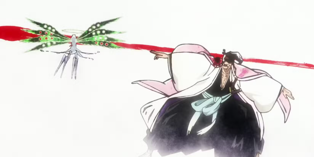 Finalmente sendo forçado a usar a sua Bankai, em uma situação favorável para a mesma, ele e Kubo nós dão um show em uma habilidade que é do mais puro storytelling. Divida em quatro atos, assim como uma boa história, o teatro suicida (Katen Kyōkotsu: Karamatsu Shinjū) transforma todos na cena em atores forçados, no caso Lille fazendo o papel do homem, e Shunsui o da mulher, que ao final assassina o próprio marido, em um final digno de tragédia.